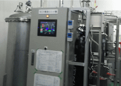 装置のモニターで数値を確認しクリアしたWOXが充填タンクに移送されます。 |