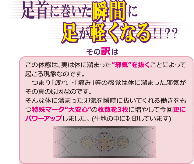 潜在能力開発のノウハウから独自に開発した「カタチと色と言葉(言霊)」の組み合わせによる特殊デザイン “大安心マーク”(内部に封入)により身体に溜まった“邪気”を出すと同時に“氣”のエネルギーを取り込むことができます 。