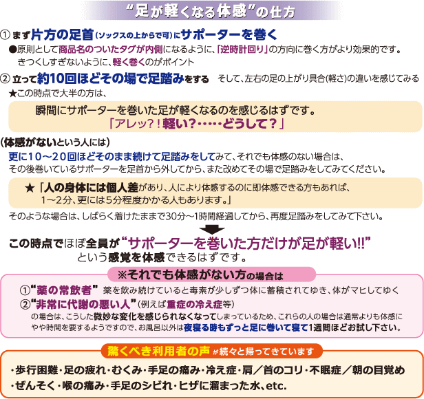 足首にビックリ感動サポーターを巻いたとたんに“アレッ!?”足が急に軽くなったと実感しました。 |