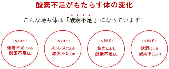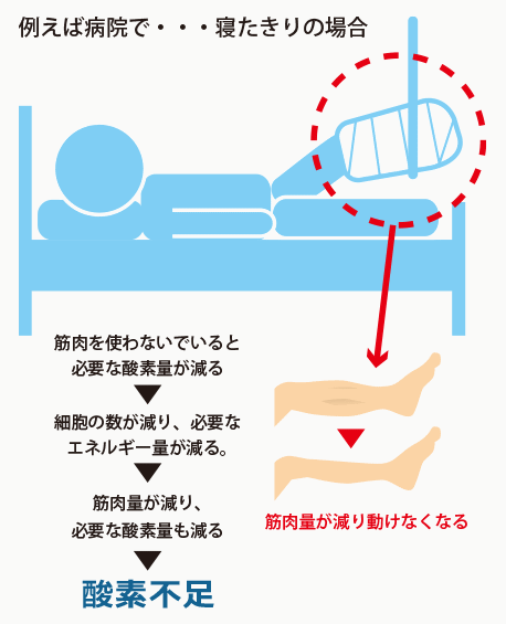 運動をしていないと日常生活に必要なエネルギー量が少なくなり、そのエネルギー量が少なくても良い状態が通常となっていくことでエネルギー産生に必要な酸素摂取量が増々減り、さらに酸素不足となる。