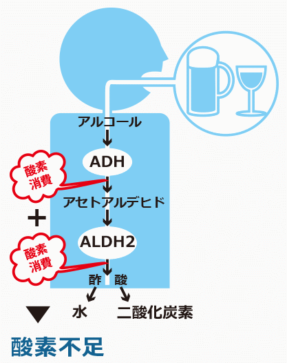 アルコールは2段階で酸素が消費されるので、酸素不足を考えて飲酒することが大切。 |