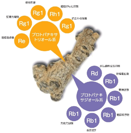 希少なサポニンをはじめ、田七ケトン、デンシチン、フラボノイドやギャバ、植物ステロール、有機ゲルマニウム、身体の調整役であるミネラルは鉄分、カルシウム、亜鉛、ナトリウム、リン、銅など。