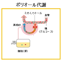イノシトールはグルコース同様に糸球体より排泄され、尿細管で再吸収される性質を持っていますが、尿細管におけるイノシトールの再吸収はグルコースと競合してしまうので、高血糖で尿糖が存在する場合は、グルコースとの再吸収に負けて体外へ排出されてしまいます。