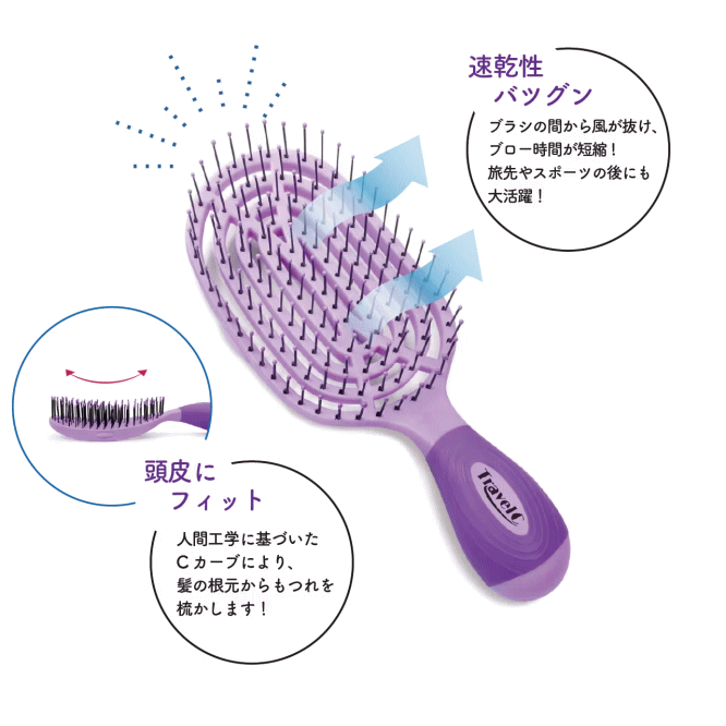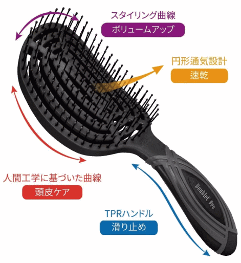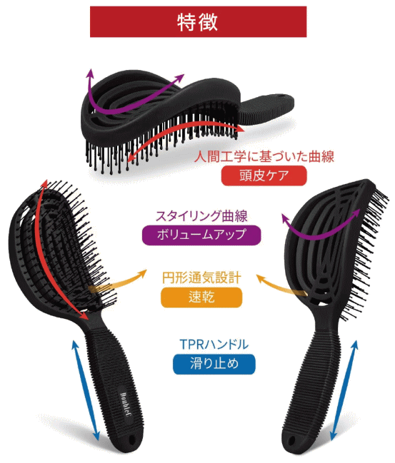 特徴的な2つのCカーブが、ブラッシング時の髪と頭皮の負担を抑え、スムーズにスタイリングできるのが特徴です。