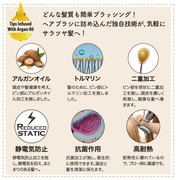 アルガンオイルとトルマリンを二重に含侵させたピンが、髪のもつれと絡まりをスムーズに梳かします。