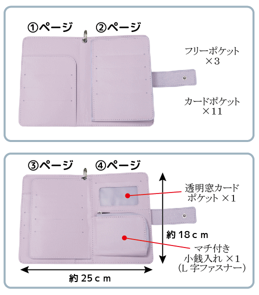 ●仕様:カードポケット×11、フリーポケット大×3、透明カードポケット×1、マチ付き小銭入れ×1