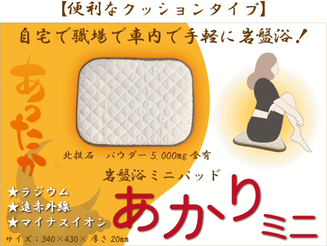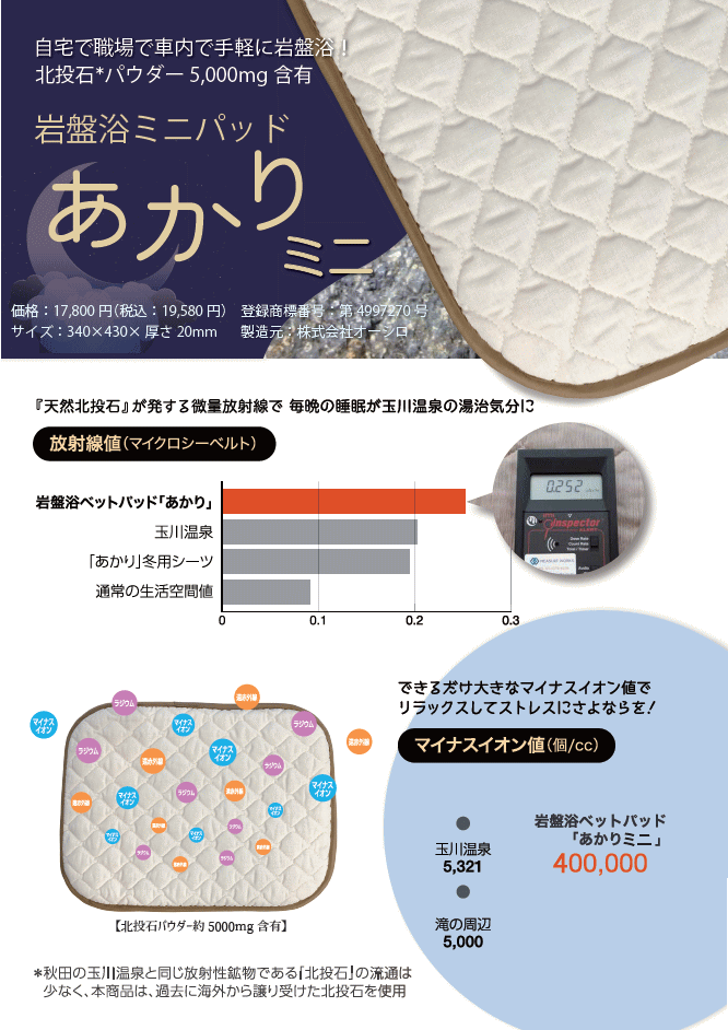 この効果を狙い、玉川温泉には多くの方が湯治に行かれていますが、毎日ご自宅の睡眠時に玉川温泉と同じような状態で眠ることができるのが、この岩盤浴ミニパッド「あかりミニ」です。 |