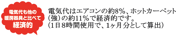 ●電気代はエアコンの約8%、ホットカーペット(強)の約11%で経済的です。