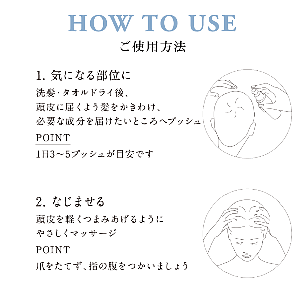 洗髪後、適量を気になる部位に塗布してください。