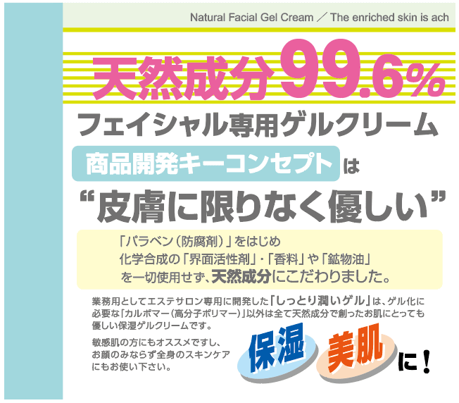 | ★今回新たに商品化したフェイシャルエステ専用のゲルクリームには、これらの問題点を残念ながら100%クリアーとは言えないまでも99.6%天然成分を用いた女性にとってはほぼ“理想に近いゲルクリーム”の商品化に成功しました。 |