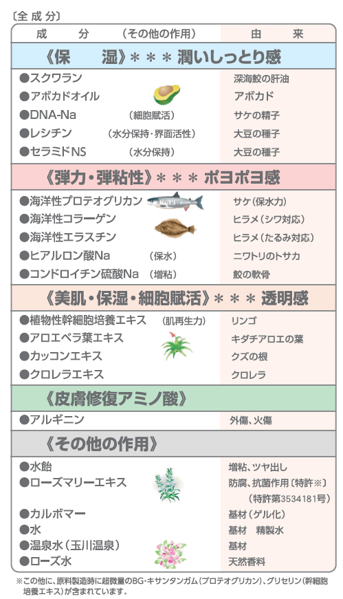 | 水、水飴、センチフォリアバラ花水、スクワラン、アポガド油、温泉水(玉川温泉水)、水溶性コラーゲン、水溶性エラスチン、水溶性プロテオグリカン、リンゴ果実培養細胞エキス、ヒアルロン酸Na、コンドロイチン硫酸Na、DNA-Na、レシチン、セラミドNS、ローズマリー葉エキス、アロエベラ葉エキス、クズ根エキス、クロレラエキス、カルボマー、アルギニン、グリセリン、BG、キサンタンガム |