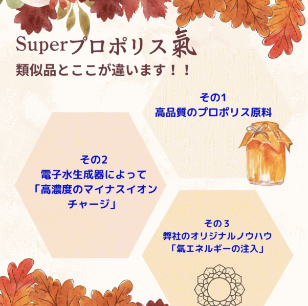 具体的には「プロポリス」原液に対して24時間の“マイナスイオンチャージ”を行っています。 |