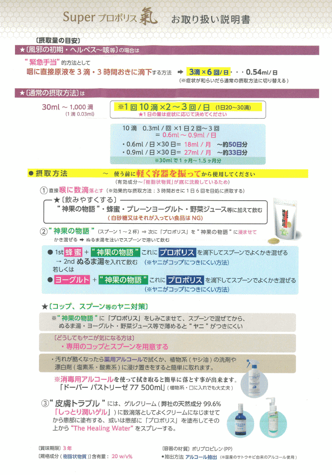 ●1回に10〜20滴を日に2〜3回にわけて、蜂蜜、プレーンヨーグルト等に混ぜてお飲みください。
