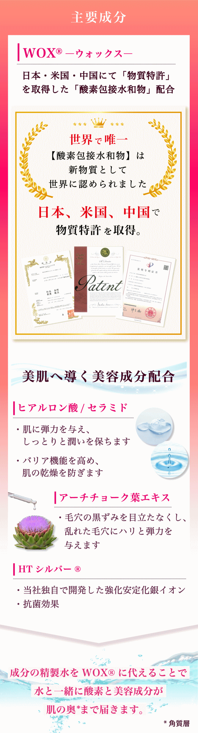 また、精製水をWOXに替え成分を一新し、浸透が良く成分を肌の奥まで届けます。 |